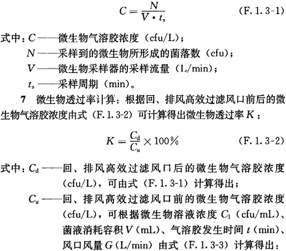 1 制定方案:明確評價任務,制定詳細的評價方案,包括確定微生物氣溶膠、發生器所需的菌液濃度、潔凈壓縮空氣流量,確定在回、排風高效過濾風口出風端的微生物采樣周期、采樣次數等,一般可根據回、排風高效過濾風口的塵埃顆粒物過濾效率進行計算。