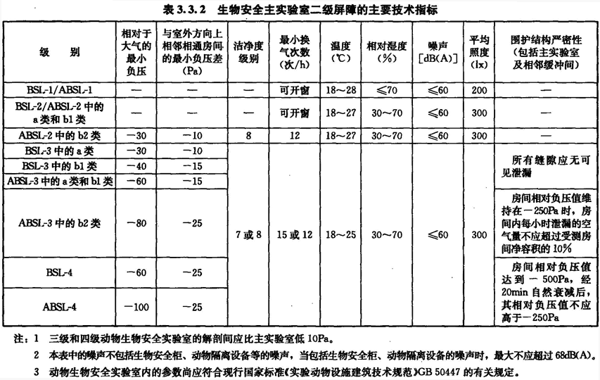 3.3.2 生物安全主實驗室二級屏障的主要技術指標應符合表3.3.2的規定。
