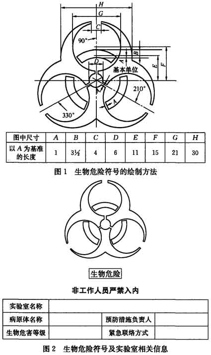 4.2.8 二級、三級、四級生物安全實驗室的操作對象都不同程度地對人員和環(huán)境有危害性,因此根據(jù)國際相關(guān)標(biāo)準(zhǔn),生物安全實驗室入口處必須明確標(biāo)示出國際通用生物危險符號。生物危險符號可參照圖1繪制。在生物危險符號的下方應(yīng)同時標(biāo)明實驗室名稱、預(yù)防措施負責(zé)人、緊急聯(lián)絡(luò)方式等有關(guān)信息,可參照圖2。